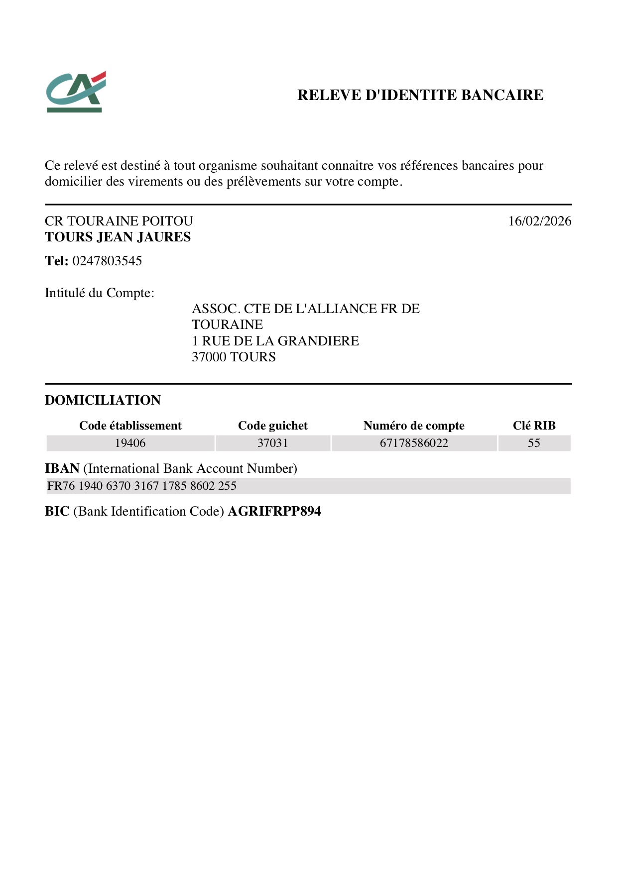 Le montant de l’adhésion pour l’année, par chèque au nom de l’Alliance Française de Touraine, est de 30 €. Vous serez ainsi informé de toutes nos activités. Votre adhésion peut être déduite de vos impôts car l’Association est reconnue d’utilité publique.